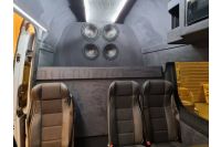 Asiakas halusi päivittää jatko-ohjaamollisen Sprinterin audiopuolen uusiksi. Asiakkaan toiveena oli saada reilusti lisää bassoa ja äänenlaatua säilyttäen kuitenkin auton alkuperäinen soitin. Asiakkaan toivomuksesta auton etuovien vakiokaiuttimet vaihdettiin uusiin jälkiasenteisiin kaiuttimiin. Myös matkustamon kattoon lisättiin customityönä uudet kaiuttimet. Lisäksi asiakkaalle suunniteltiin ja toteutettiin customityönä takaseinään neljän 12" subwooferin suljettu kotelo.
