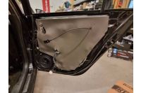 |   Etuoven kaiutinasennusErillissarjaksi valittiin MDS:n FP6B-huippukaiutinsarja. FP6B-kaiutinsarjan laaja taajuusvaste takaa midbassokkaan ja puhtaan soundin. Kaiuttimien asennuksessa on käytetty autokohtaisia CT25NS02-soviterenkaita. Etukaiuttimien asennuksessa käytettiin korokerenkaita (MDF165-12), jotta uuden kaiuttimen magneetti ei ota kiinni ikkunapalkkiin. |   Vakio ovipahviOvipahvin vaimennus on tärkeä osa ovirakenteiden vaimentamisessa. Ovipahviin suositellaan käytettäväksi pehmytmattoa. Tähän autoon käytettiin 10mm paksua Kicx SB 10. |