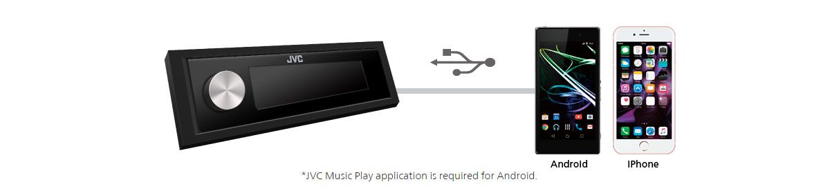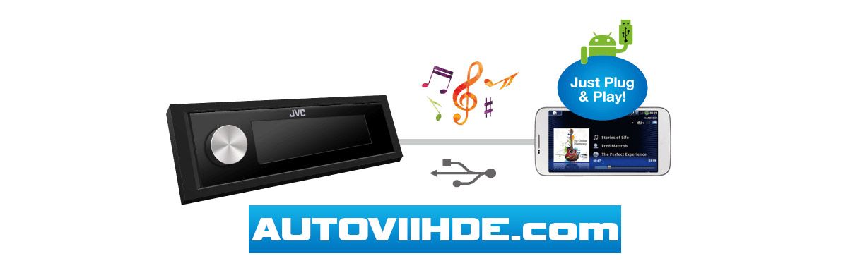 AUTO MODE / AUDIO MODELiitä Android älypuhelin tai tabletti soittimeen USB:n avulla ja nauti "plug and play" musiikin toistosta. Androidin Open Accessory Protocol (AOA2) on tuettuna, joten esiavalmisteluja tai asetusten muuttamisia ei tarvita. Mikäli haluat toistaa musiikkia puhelimen muistista, valitse AUDIO MODE tai voit halutessasi ladata JVC Music play sovelluksen Google play kaupasta ja voit käyttää soittimen AUTO MODE lisätoimintoja.