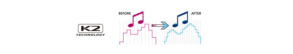 JVC K2 teknoligia tehostaa digitaalisen äänen laatua.K2 on JVCKENWOOD organisaation teknologia joka uudelleen käsittelee äänen. K2 laajentaa 44.1kHz/16 bit CD laatuista audiota 48kHz/24 bit audioksi.