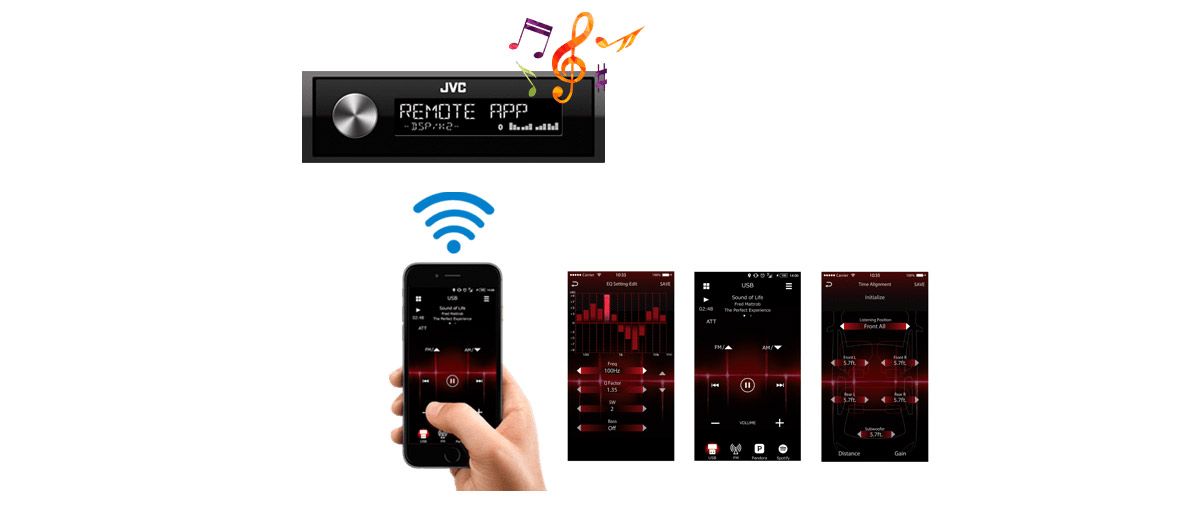 JVC remote control sovellusSoitin on yhteensopiva JVC Remote APP:in kanssa. Voit säätää soittimen ominaisuuksia suoraan puhelimestasi.